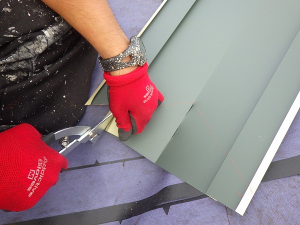 谷樋板金の軒先側を軒先の角度に合わせてカットして、流れてきた