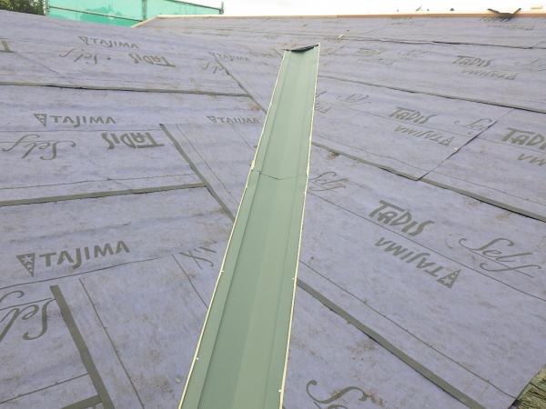 軒先側から貼り始まり上下は100ミリ重ねで、左右は300ミリ重ねで貼り付け谷樋や棟部分はルーフィングが2重になるように貼り付けました。 アスファルトルーフィングの貼り付け終了です。