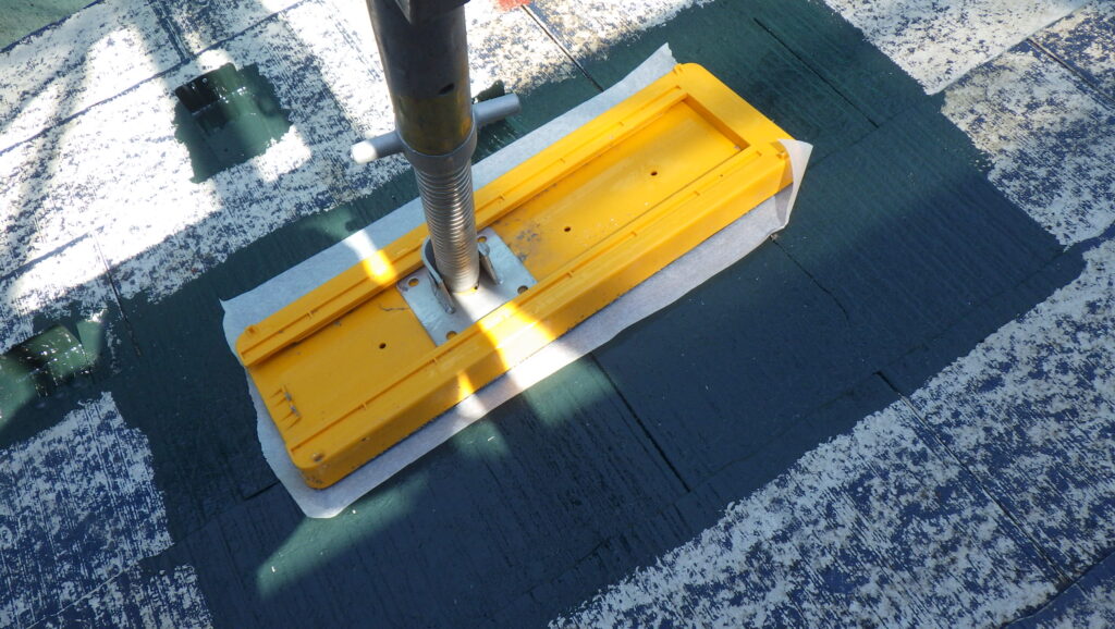 交互に足を上げながら、中塗り、上塗りを行い塗装した面と足場足のカバーが付かないよう、クッキングシートを敷き足場足を下ろしました。