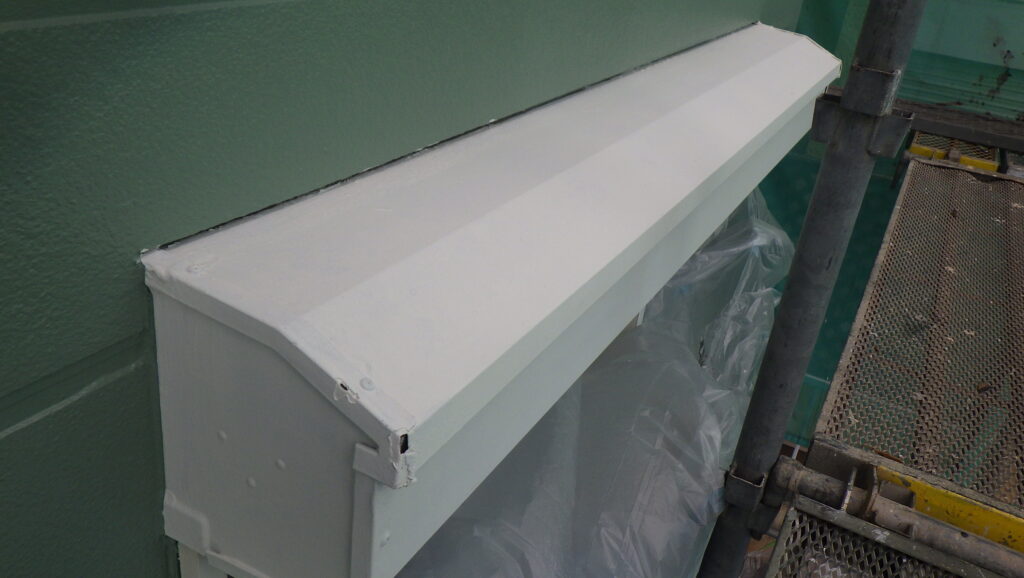 外壁は水性材を使用していますが、板金部や役物等は溶剤を使用しているので、分けて塗装をします。