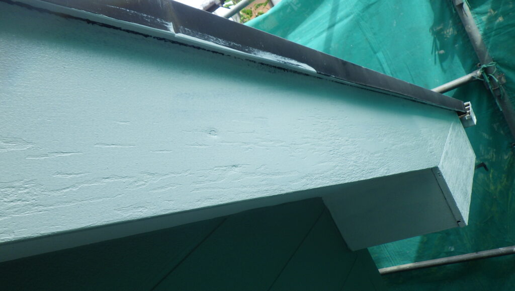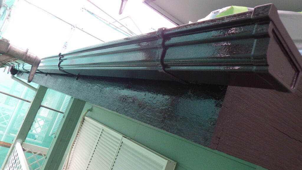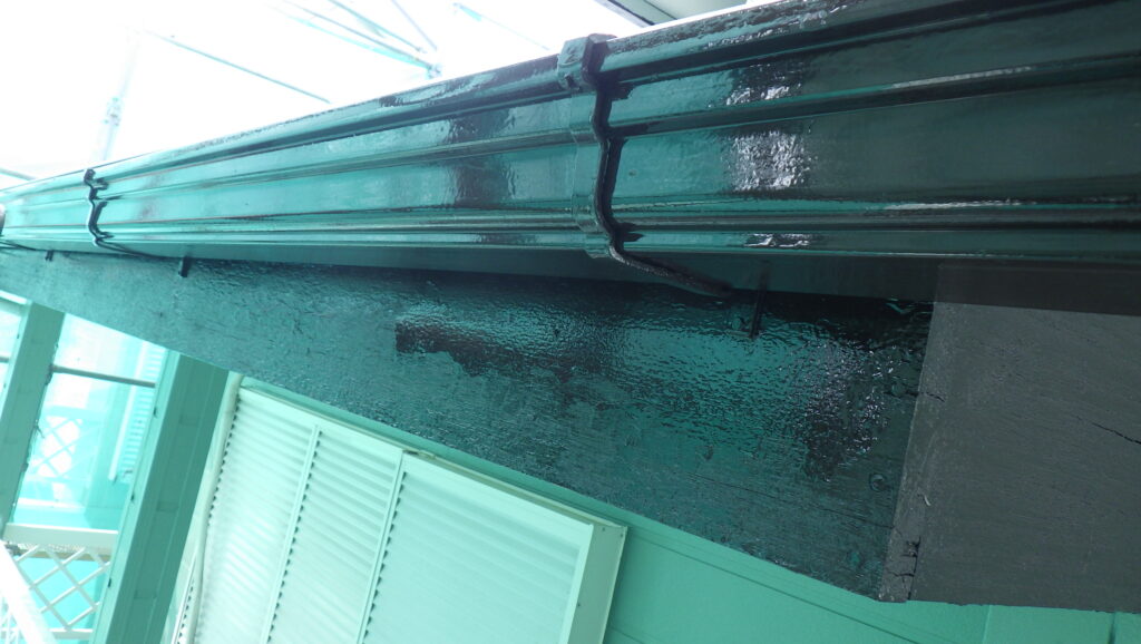 破風・鼻隠しの中塗り塗装と雨樋の一回目塗装が終わりました。