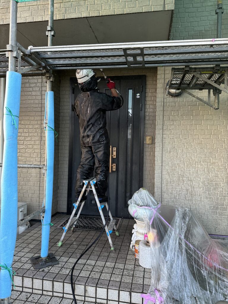 このまま新しい塗料を重ねても既存塗膜の劣化が進み、新しい塗料ごと剥がれてしまうので高圧洗浄で洗い流してから塗装を行います。