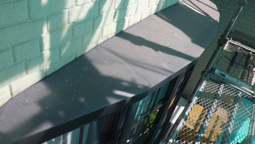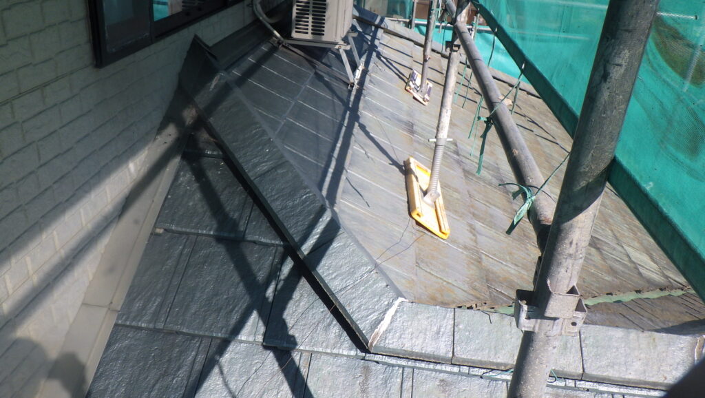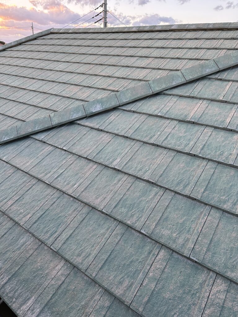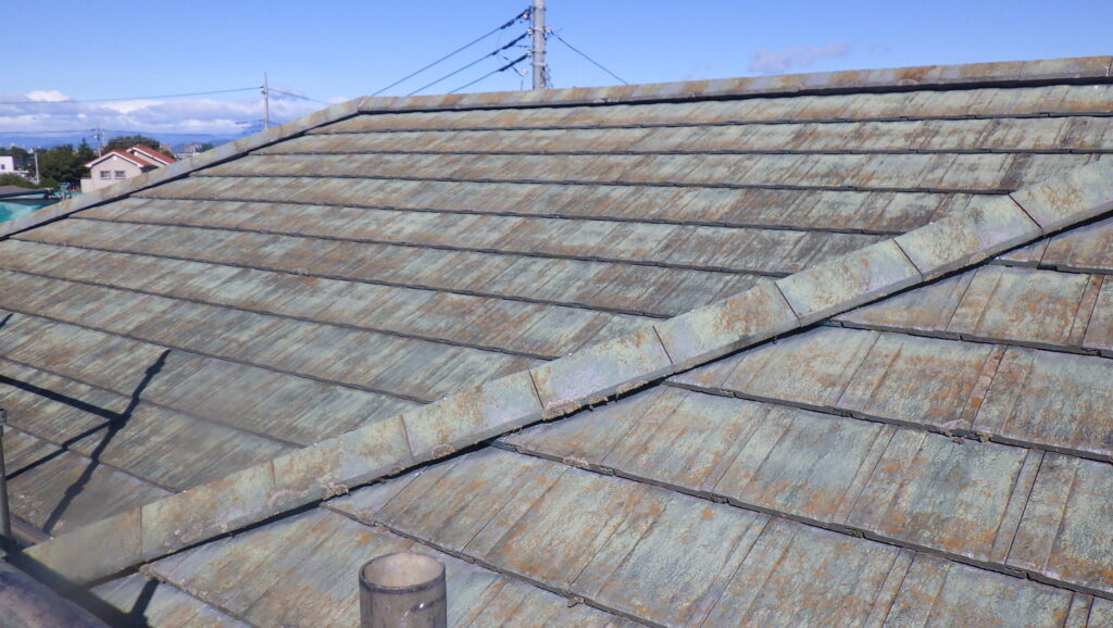 大屋根と下屋根どちらも日光が当たりやすい箇所では、既存保護塗膜の劣化により苔が生えてしまっている状態です。