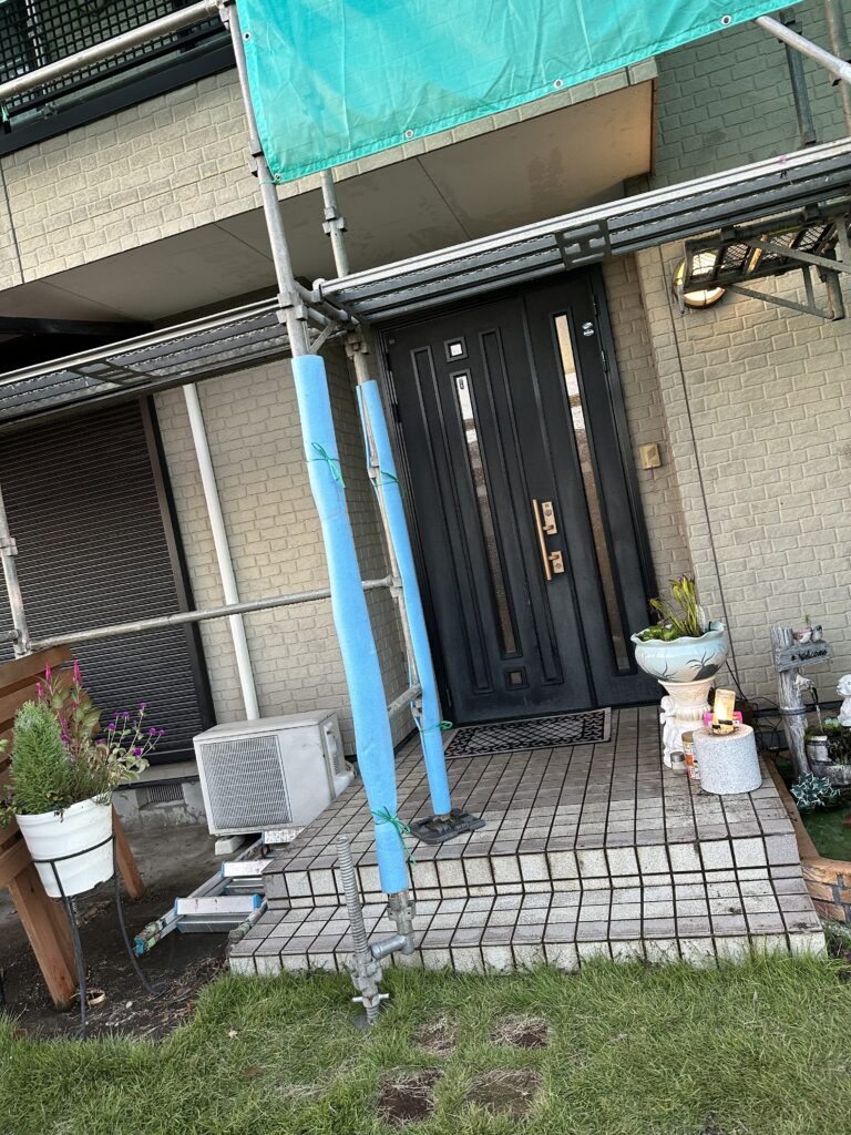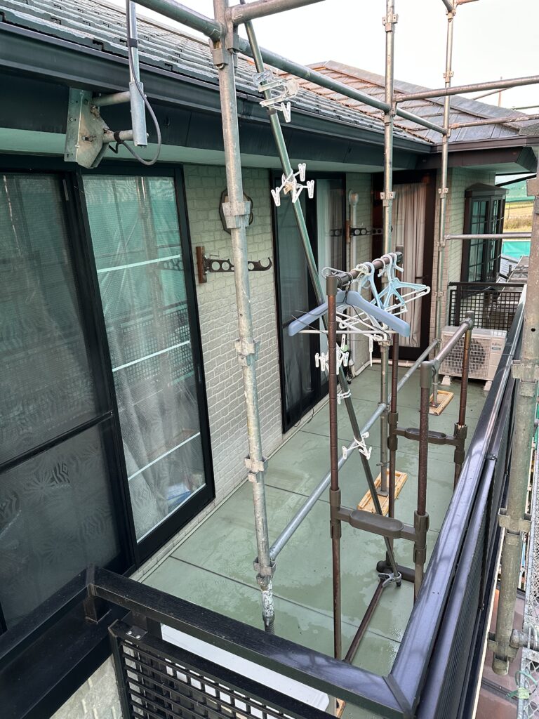 塗料が飛散しないよう、足場にはメッシュシートがかかっているので見えないですが、屋根:乾式洋瓦、外壁:窯業系サイディングの塗装工事が始まります。