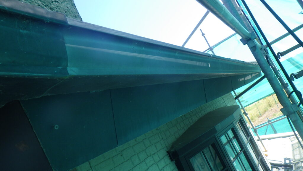 板金部は、錆は発生していないですが日光や紫外線により色が褪せてしまっていて、雨樋は水が溜まりやすいことから苔が生えてしまっている状態です。