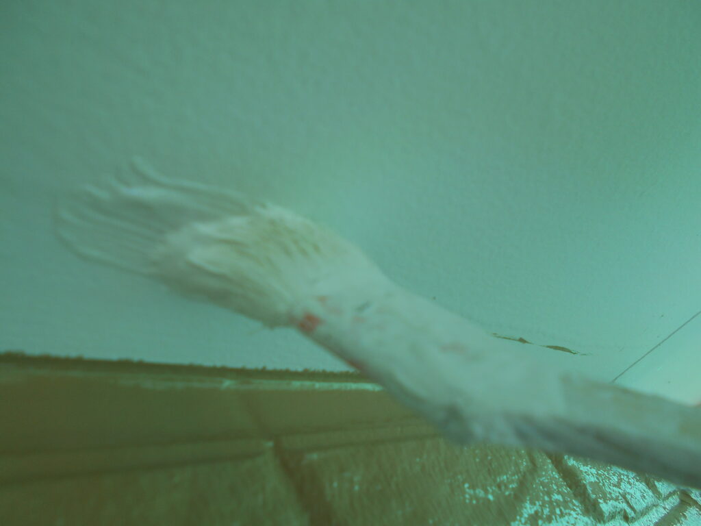 軒天の色が外壁色より薄く、一度では透けてしまうので、何度もタッチアップして塗料を重ねていきます。