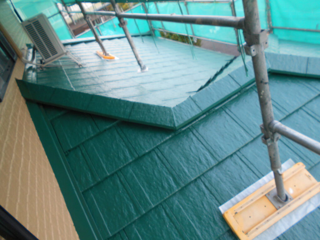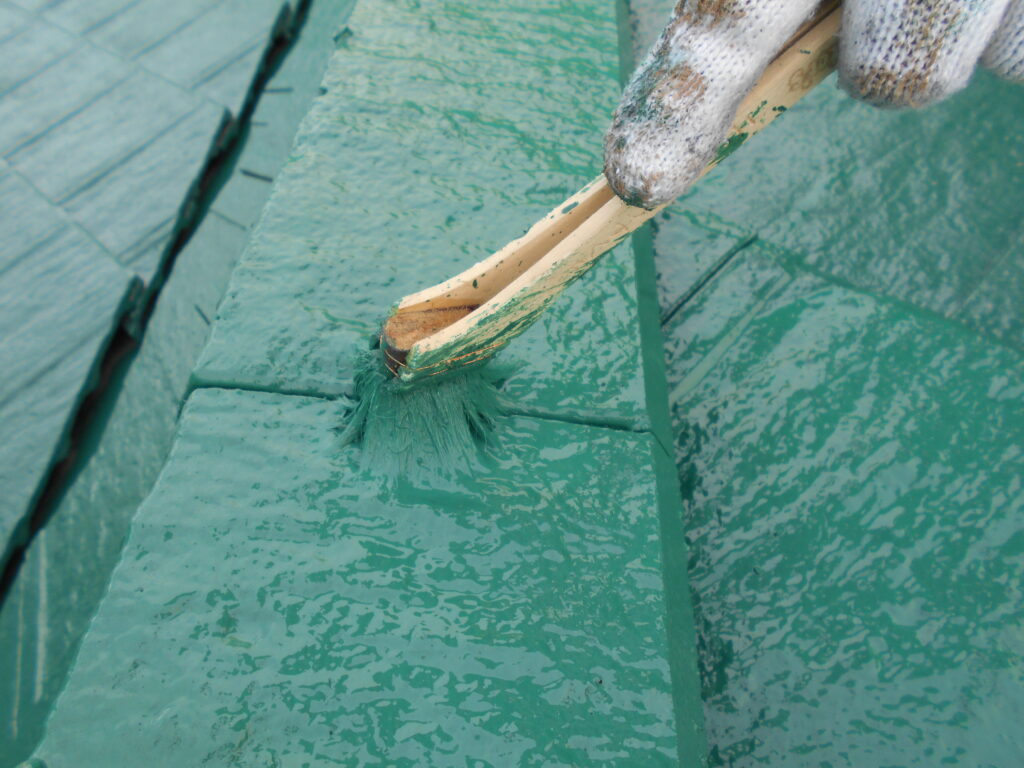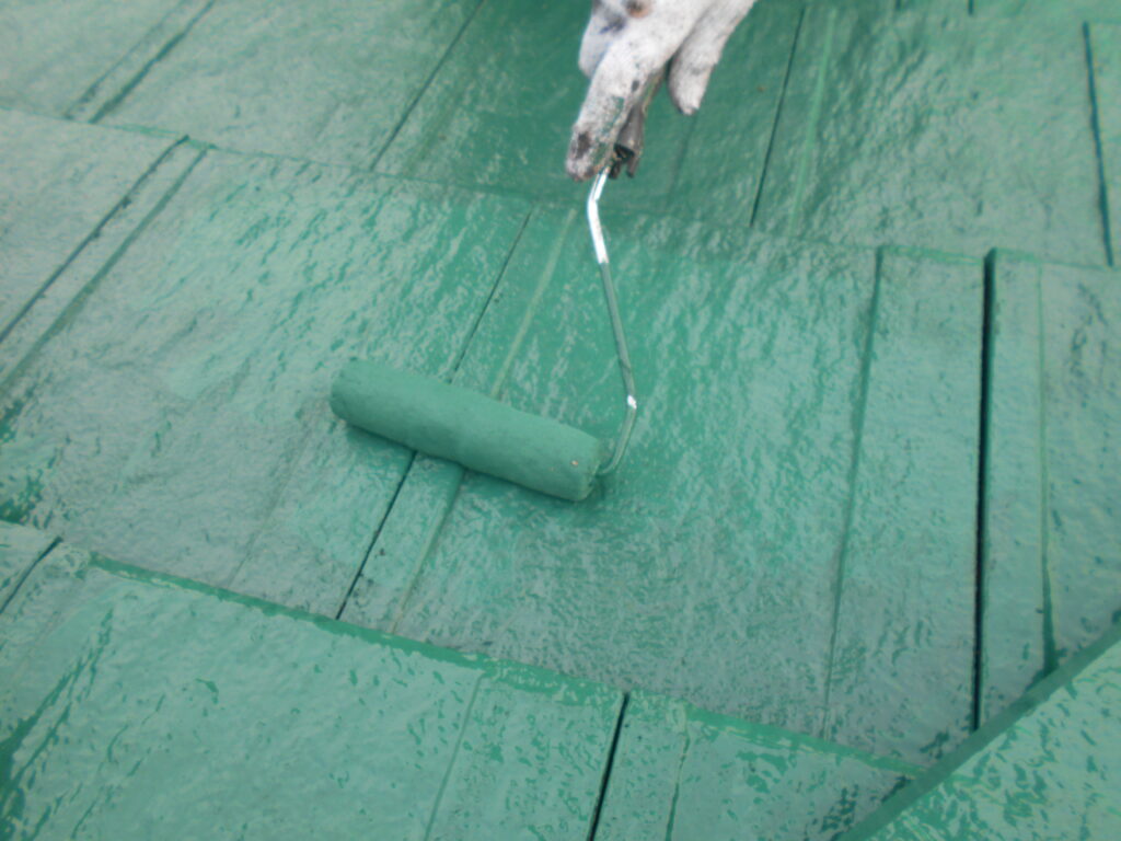目地や棟と平瓦の間を刷毛でしっかりと塗料を塗りこみ、ローラーで全体を塗装していきます。