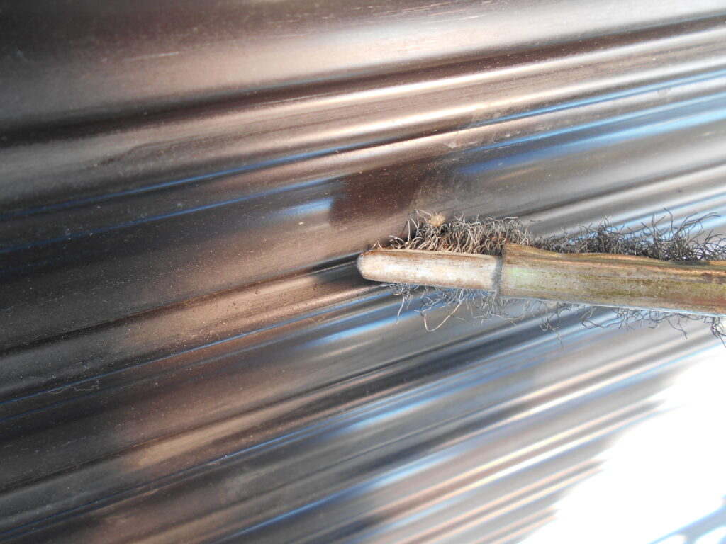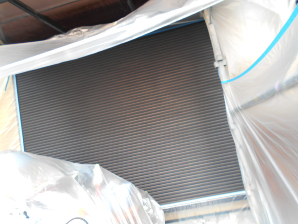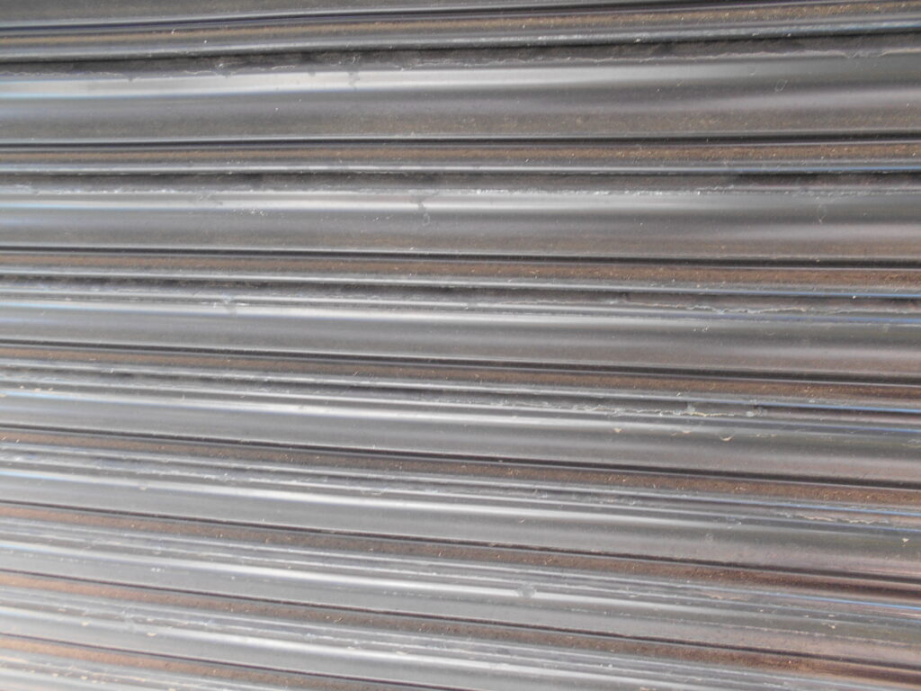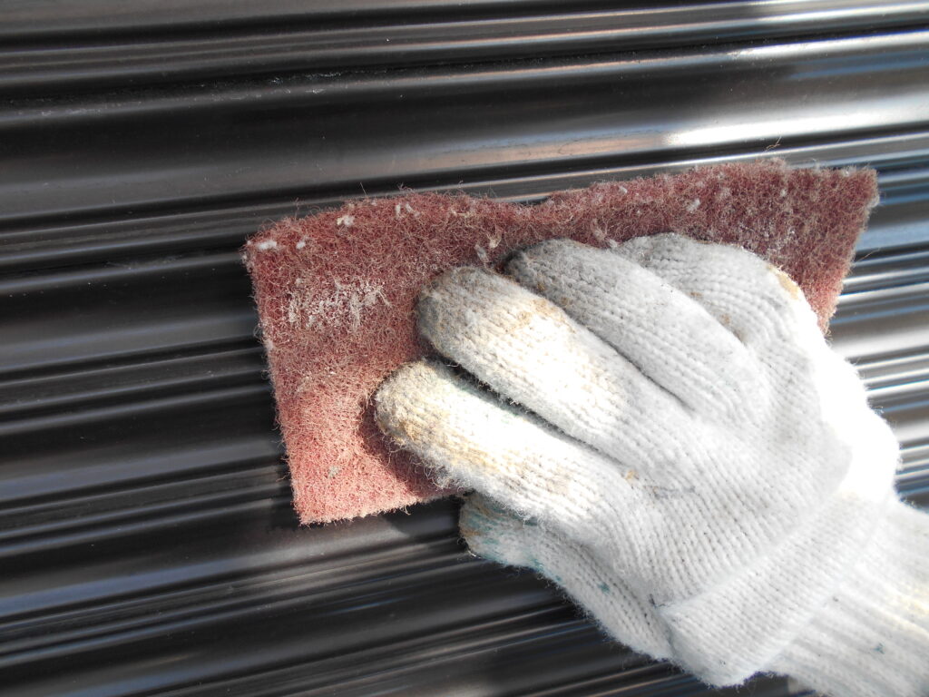 シャッターの板金表面はそこまで傷んでいませんでしたが、塗料との密着性を高めさせる為、表面を削って傷をつけました。