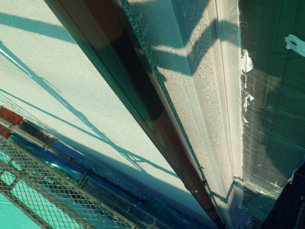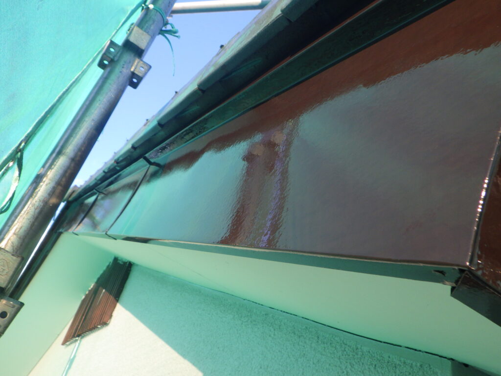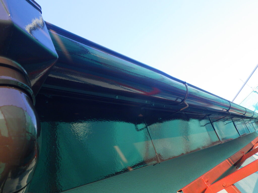軒先板金部の上塗り塗装が完了しました。