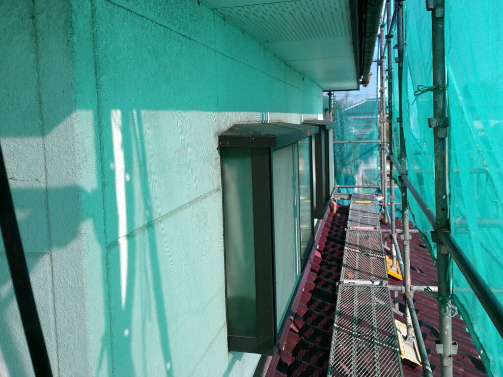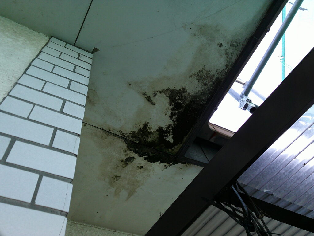 日の当たりやすい箇所では、保護塗膜が劣化することで、塗料の顔料が表面に出てしまい、チョーキング現象が起こっています。また日の当たりにくい箇所では、湿気により苔が生えています。