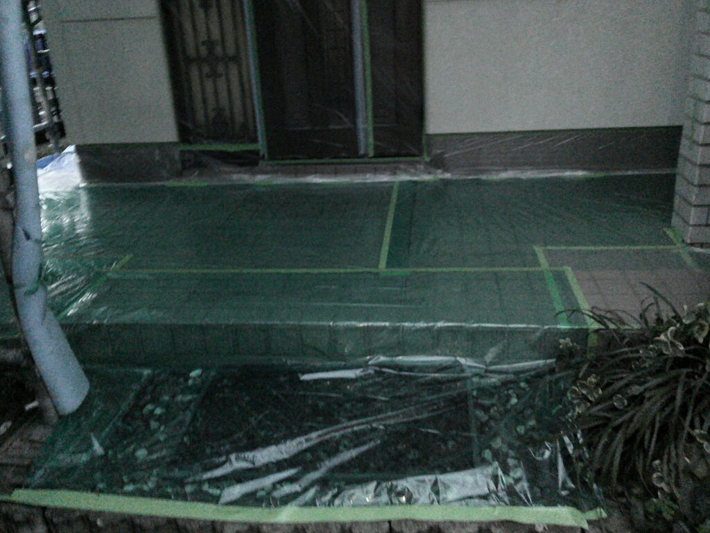 二階同様養生を行い、お客様が歩く玄関には滑りにくい加工と破れにくい加工の施されたノンスリップマスカーを使用し、養生をしました。