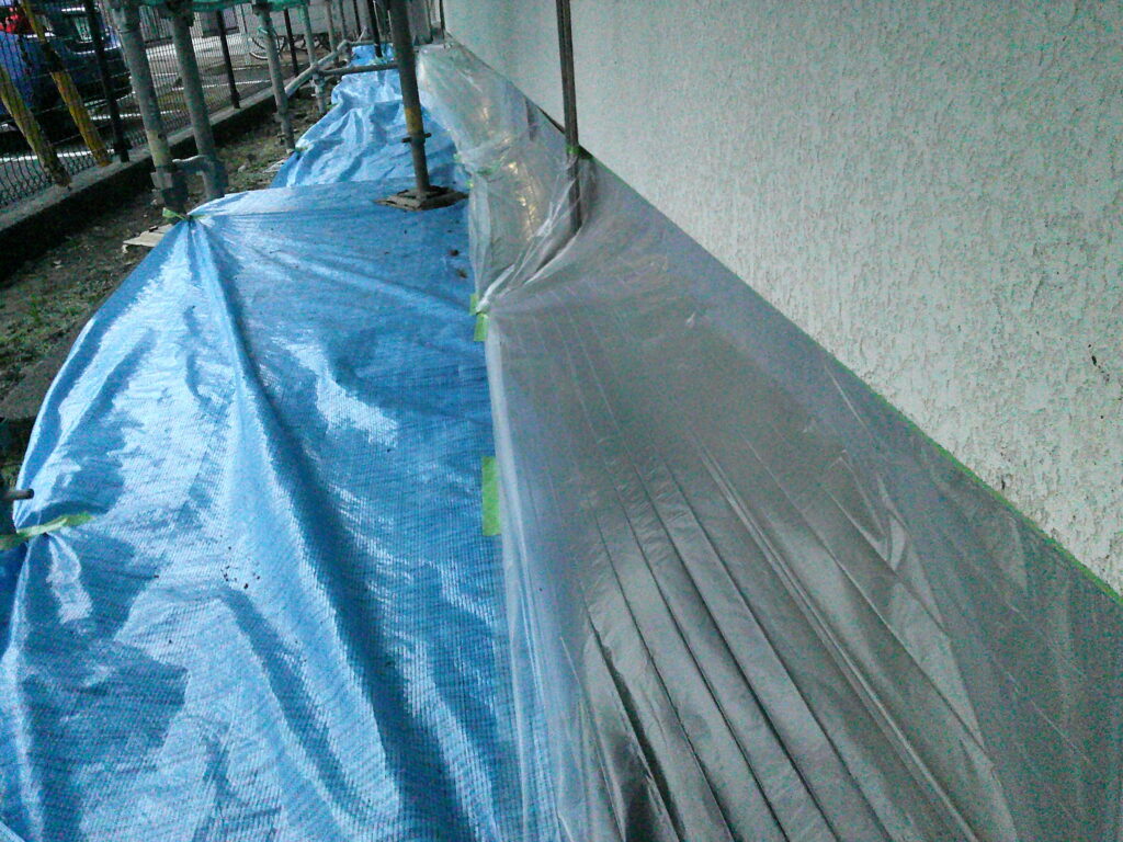 ベランダ床は塗装しないので、塗料のしみ込みにくいブルーシート、