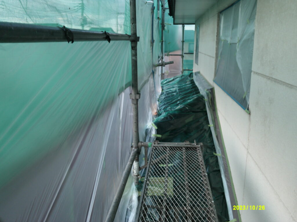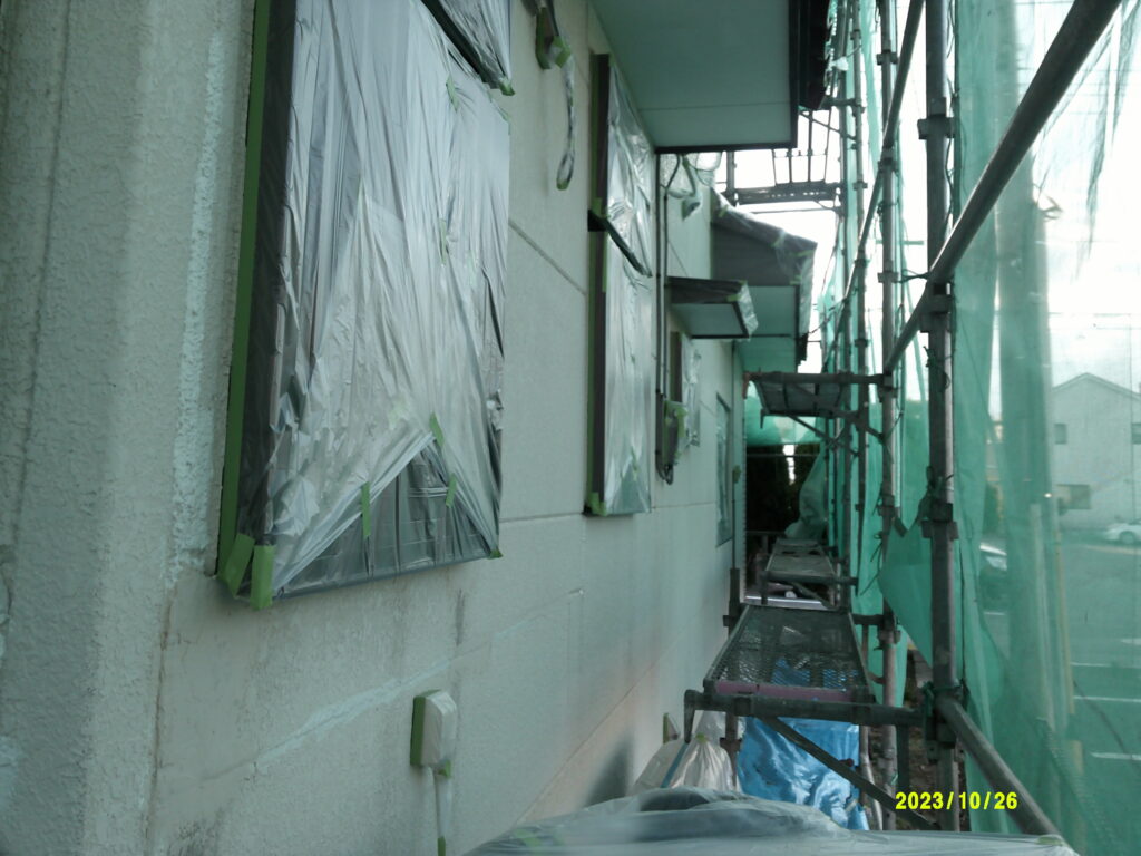窓や塗料が飛散しそうな箇所は、マスカーで養生をしました。