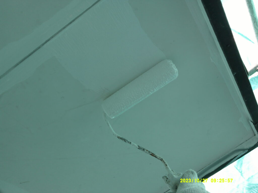 目地や板金との取り合いを刷毛で塗り込み、平面をローラーで塗装をします。