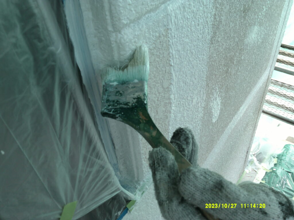 窓サッシとの取り合いは、塗料が溜まってしまうと養生を撤去する際、塗膜と一緒に剥がれるので刷毛で塗装し、