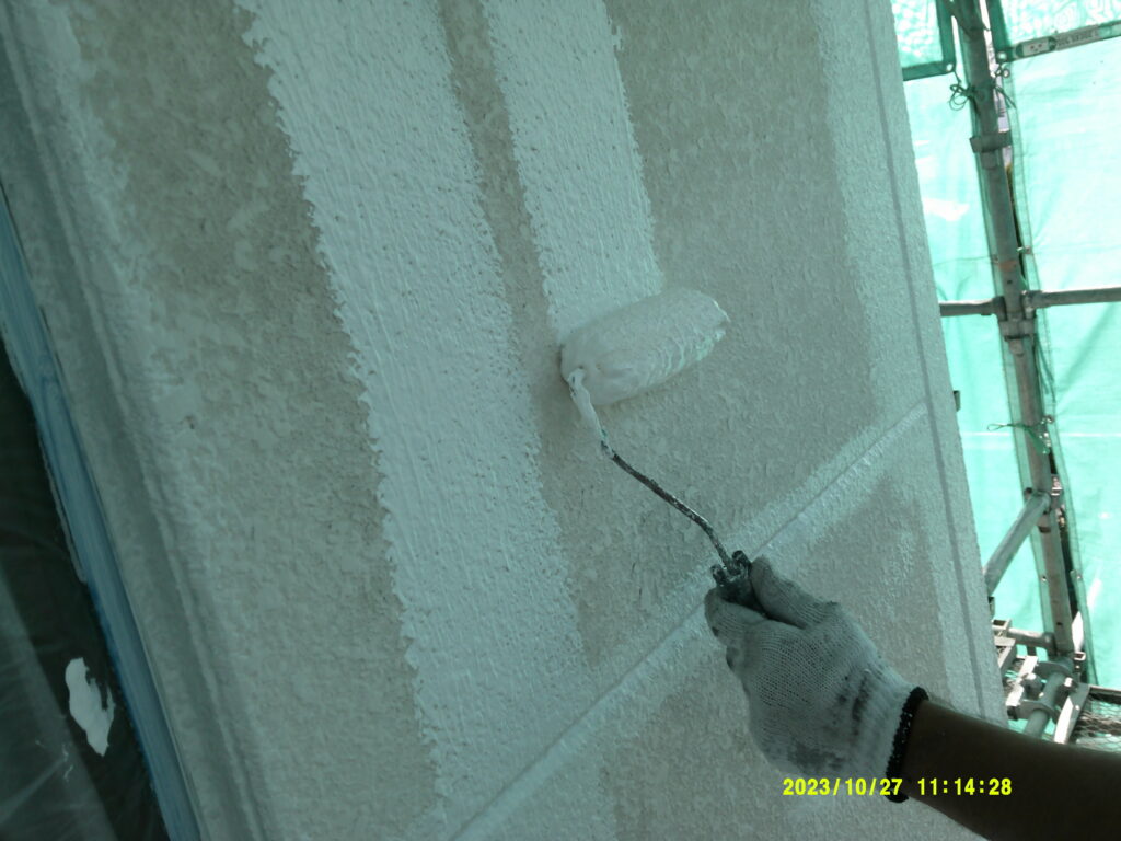 外壁平面は塗膜を膜厚にする為、ローラーで塗装をします。