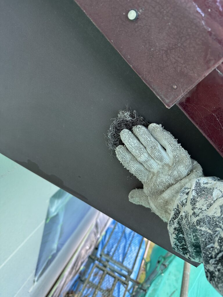 破風板が板金なので、表面のゴミや錆を除去し、また傷を付けることで塗料が密着しやすくなり、耐久性を高めることが出来ます。