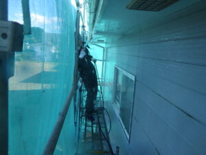 この上から塗装をしても耐久性の維持が出来ないので、洗浄で洗い落としてから塗装をします。