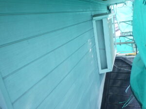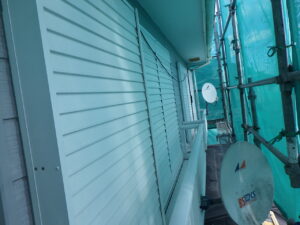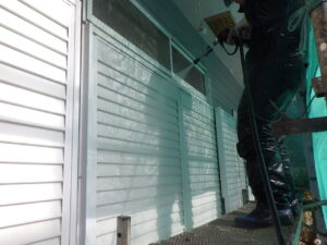 メッシュシートで覆われているので見えないですが、二階造りの窯業系外壁の塗装が始まります。