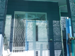 軒天は仕上がっていますが、外壁を綺麗に仕上げていきたいので、マスキングテープで養生を行いました。