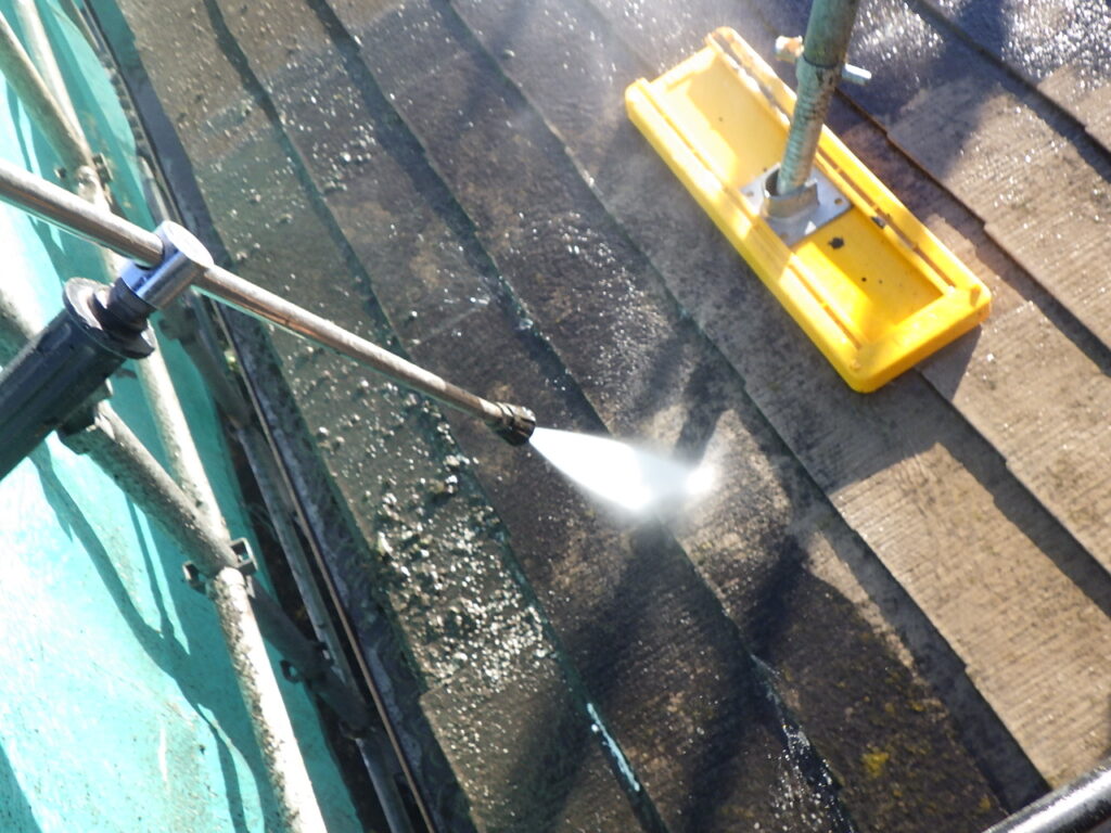 一番強いガン(トルネード)を使用し、浮いている既存保護塗膜、ゴミや埃、苔をすべて洗い流していきます。