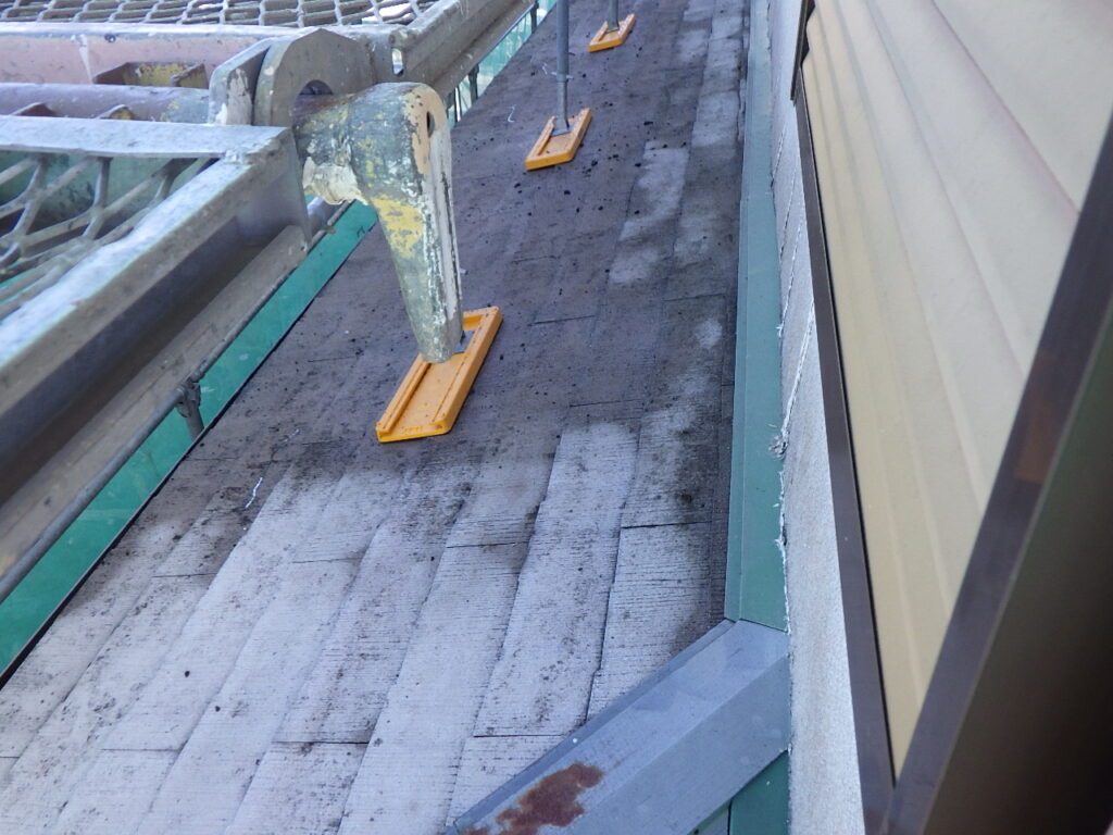 スレート屋根材は、既存保護塗膜が剥がれてしまっていて浮いてしまっていて、またさらにはゴミや埃が乗っている状態で素地(白い部分)が見えてしまっています。
