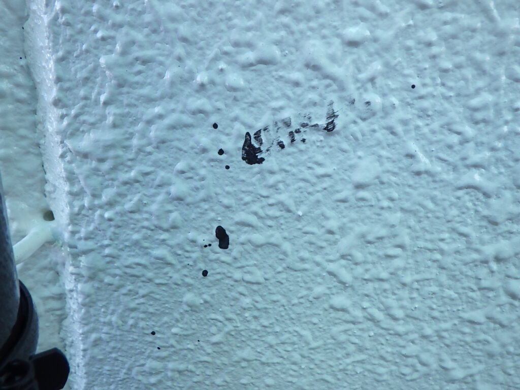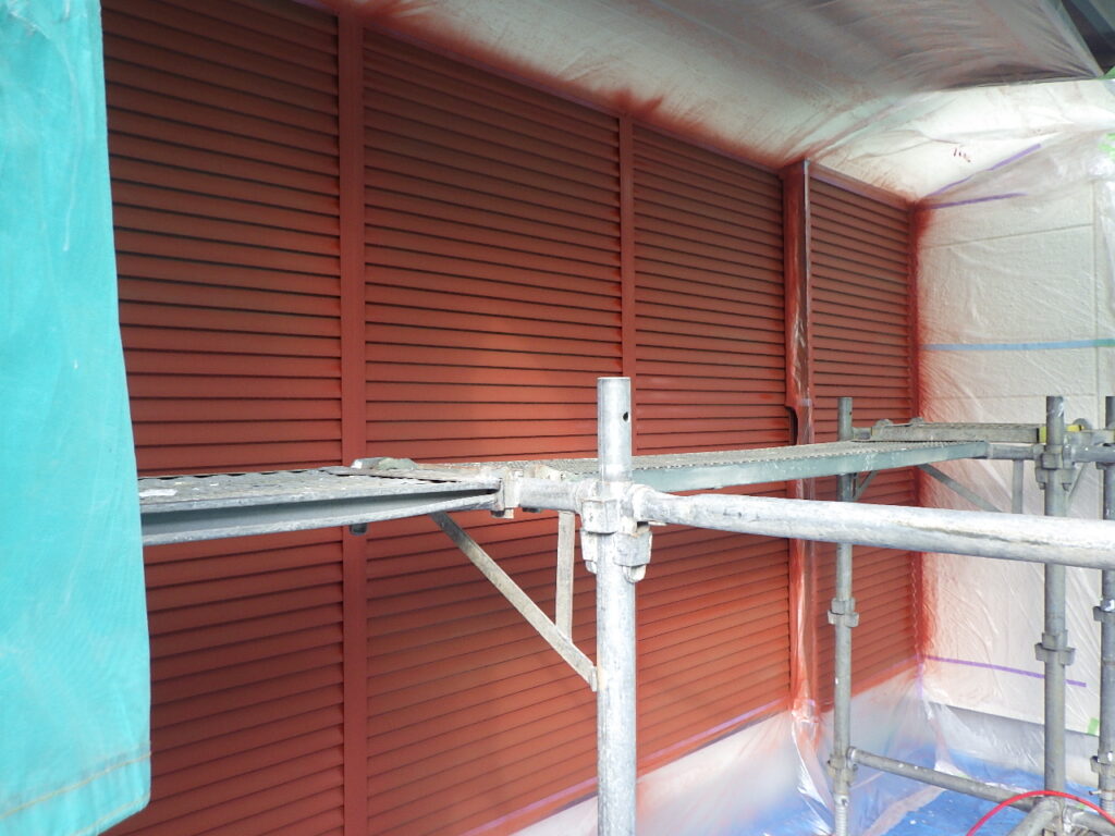 仕上がった外壁に弱溶剤系シリコン樹脂塗料が付いてしまったので、外壁塗料を上から被せていきます。