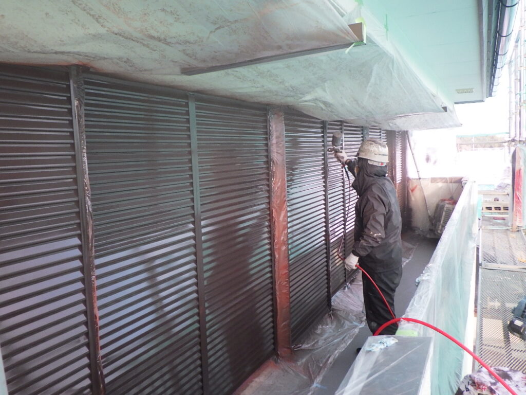 吹き付けを行う前には、ケレン施工を行いゴミや埃の除去と板金表面に傷を付けて塗料との密着性を高めました。