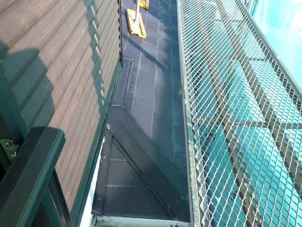 北面の下屋根は日に当たりにくく湿気が溜まりやすいので、苔が生えている状態で、東面・南面・西面は日が当たりやすいので既存保護塗膜が劣化してしまい剝がれてしまっている状態です。