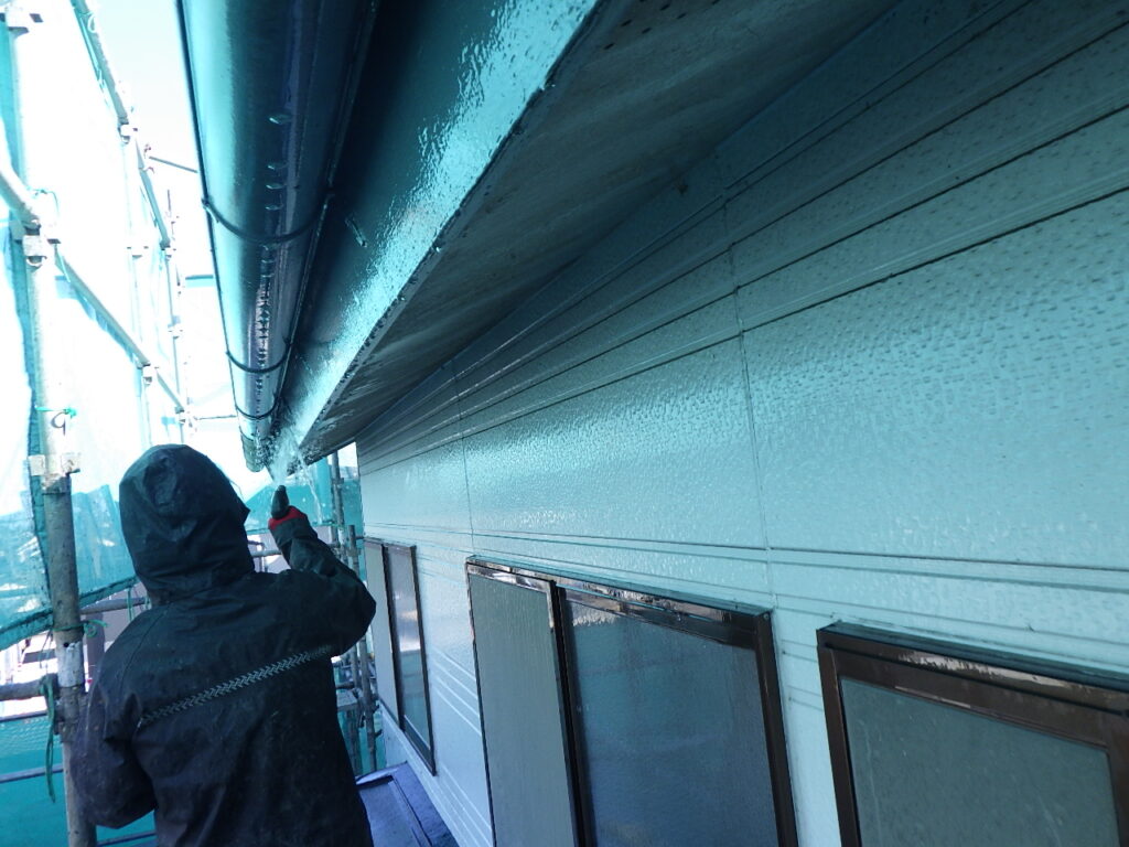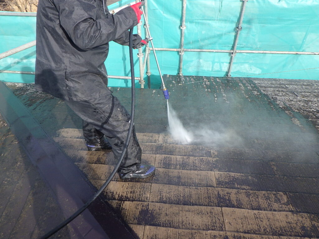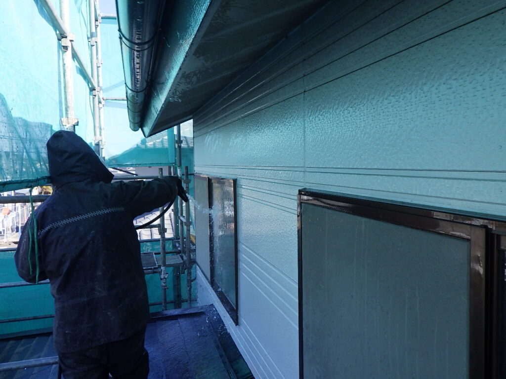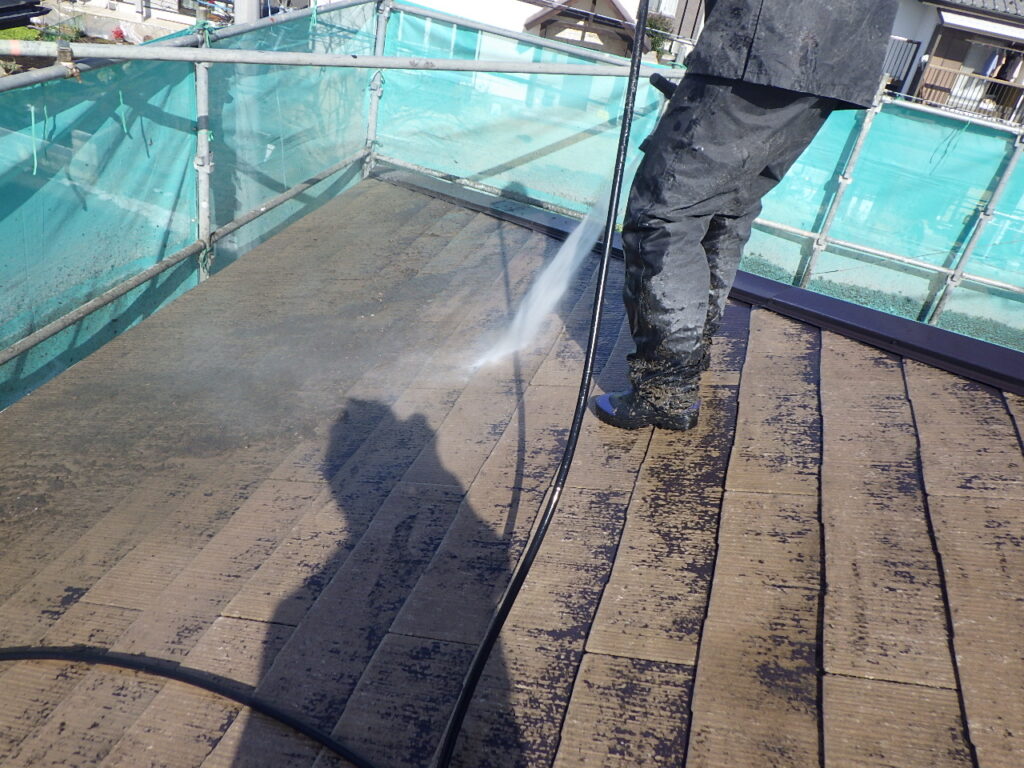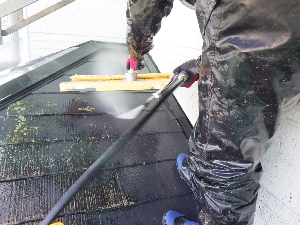 大屋根同様、このまま塗装をしても耐久性が維持できないので高圧洗浄をしてから塗装に入ります。