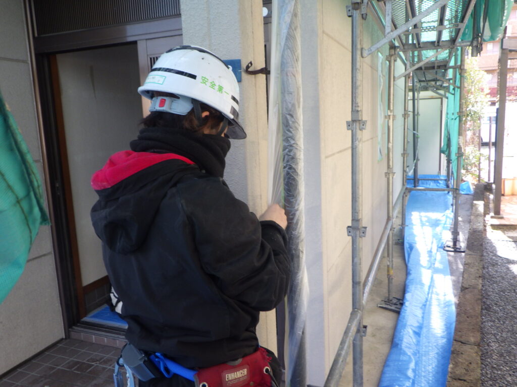 外壁回りの養生作業をしています。