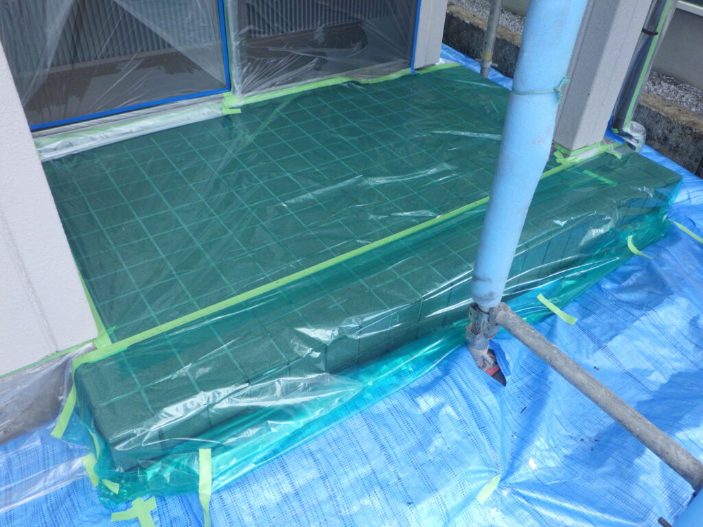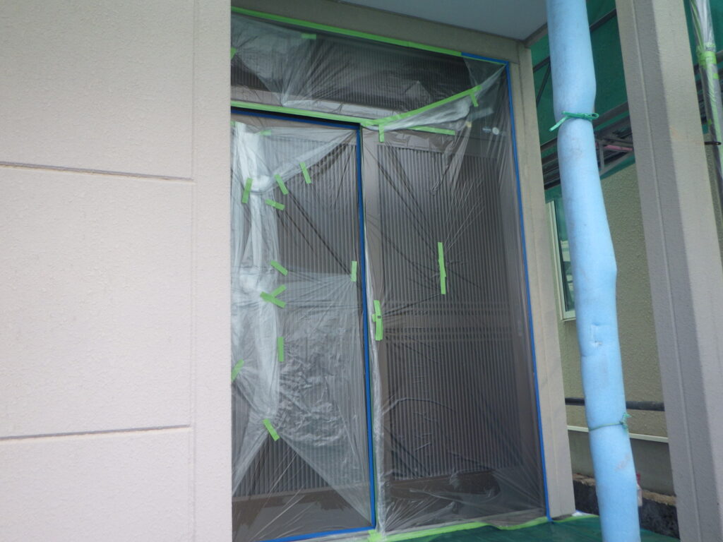 玄関やベランダ床は滑りにくく破れにくい加工がされたノンスリップマスカーで養生をし、土間は塗料がしみ込みにくい加工の施されたロールのブルーシートを使用しました。