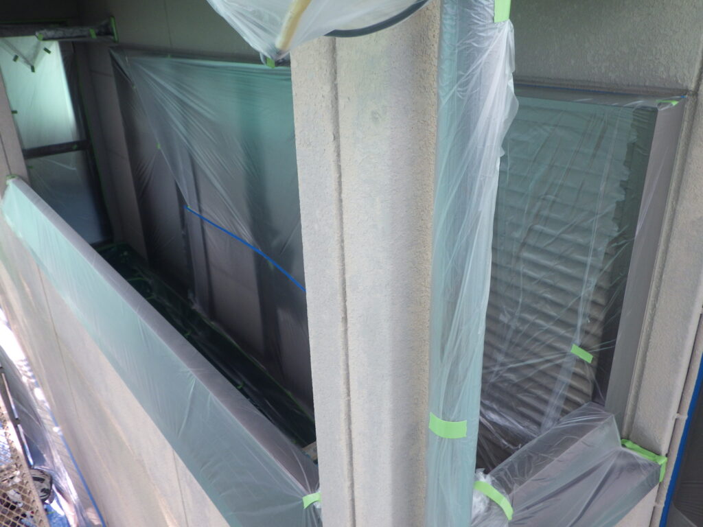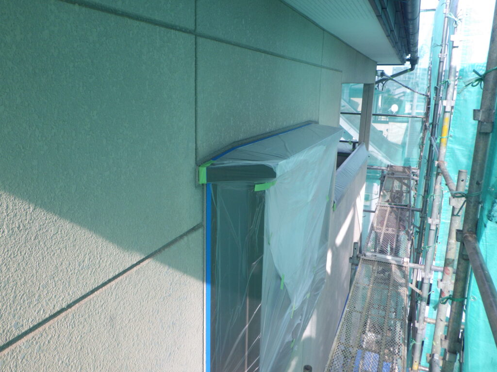 塗料が飛散してしまう箇所や塗装をしない箇所、溶剤系で塗装をする箇所をガムテープのついたビニールマスカー等で覆い、塗料で汚れてしまうのを防ぎます。