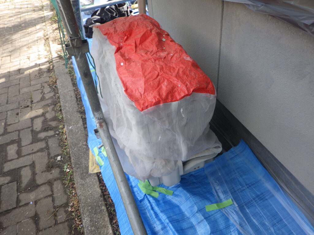 室外機は、専用の養生カバーで覆いました。万が一エアコンを使用しても空気の排出がきちんとされるので安心して使用できます。