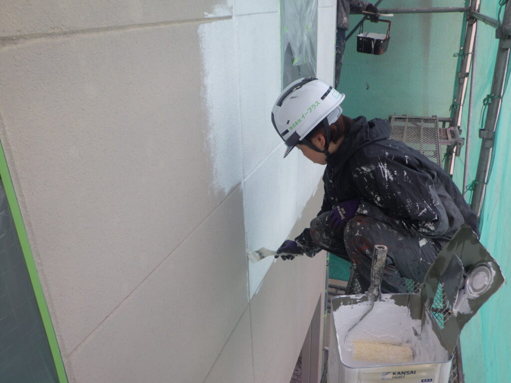 関西ペイントのアレスダイナミックフィラーを使用し、外壁の下地を行います。塗料の吸い込みを抑え、上塗りの仕上がりを良くします。水性剤なので、環境や人に害が少なく、外壁面が少し濡れていても強固な付着力を持ちます。