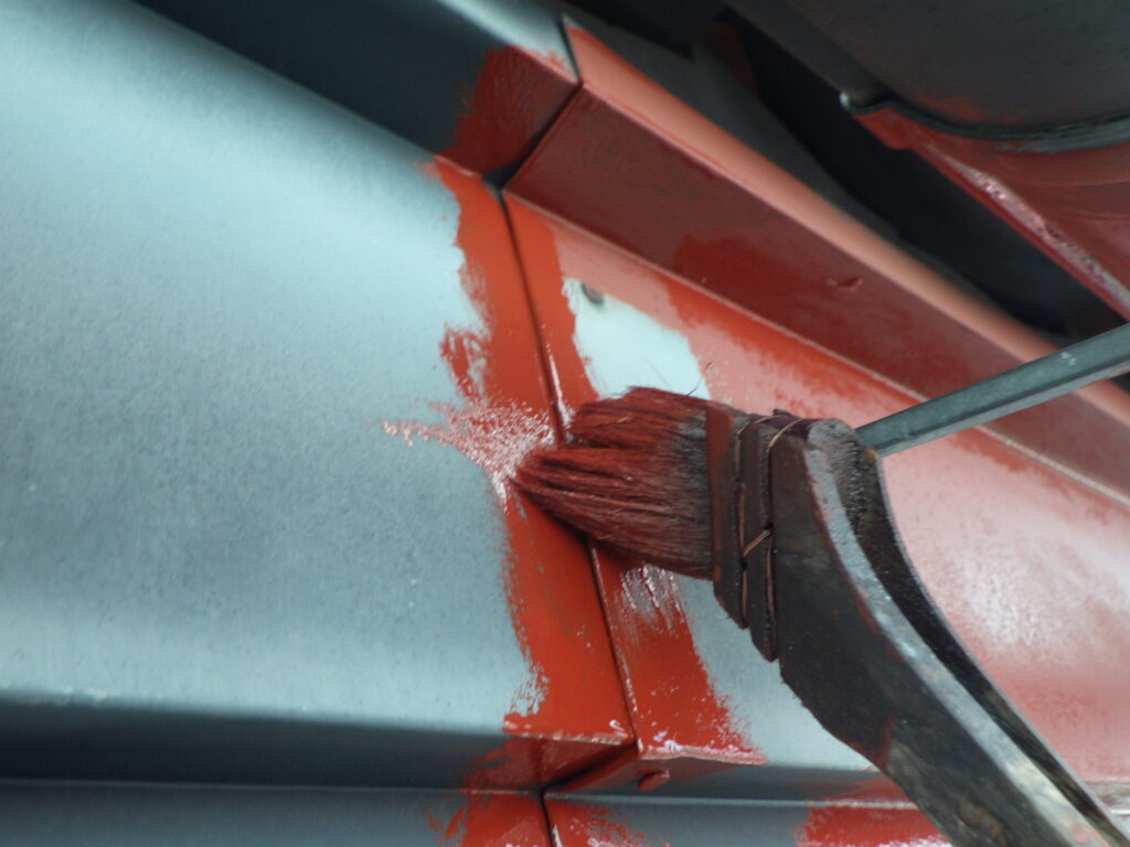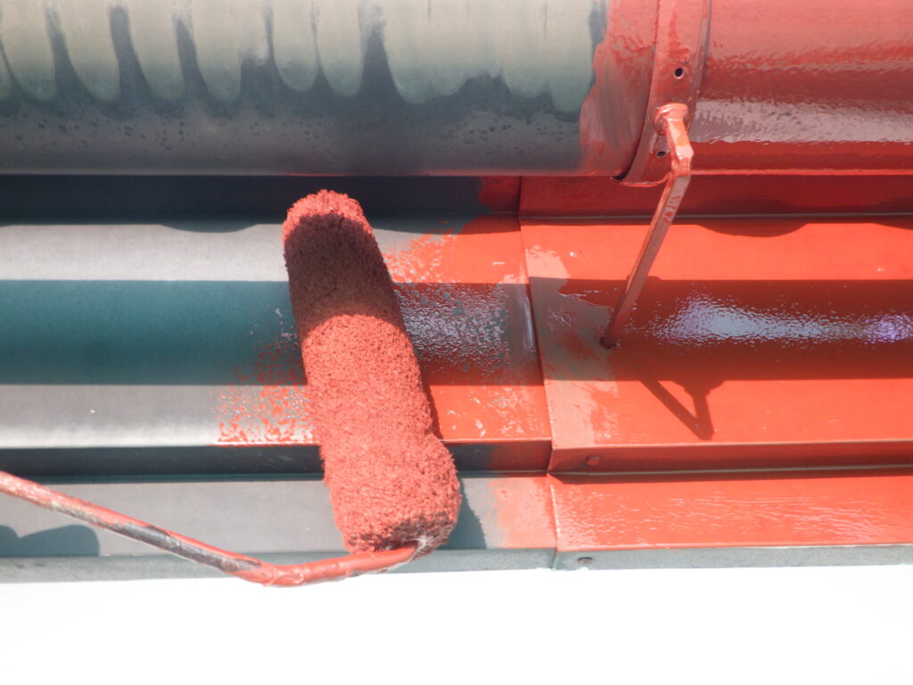 破風鼻隠しと軒樋が板金仕様なので、下塗り材として関西ペイントのザウルスEXⅡを使用し、傷んだ素地を強固させていきます。段差や隙間等を刷毛で塗り込みながらローラーで全体を塗装し、上塗りの仕上がりを良くさせていきます。