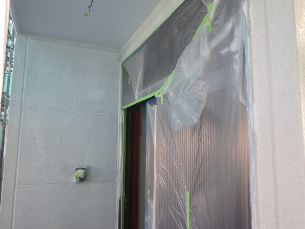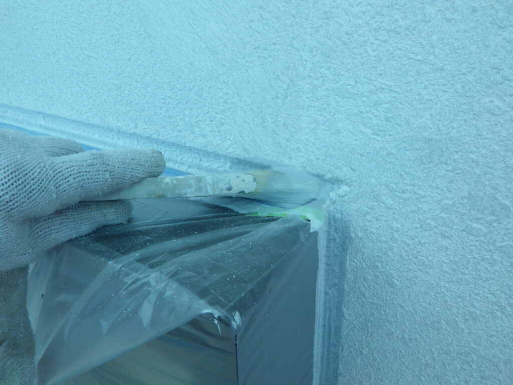 窓サッシ回りや役物周りは、塗膜を厚くしてしまうと養生を撤去した際に、塗膜が一緒に剥がれてしまうので、刷毛での塗装を行うことで綺麗に仕上がります。