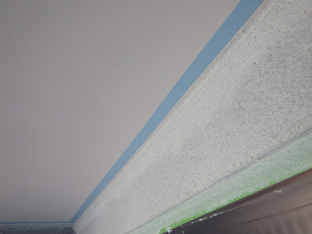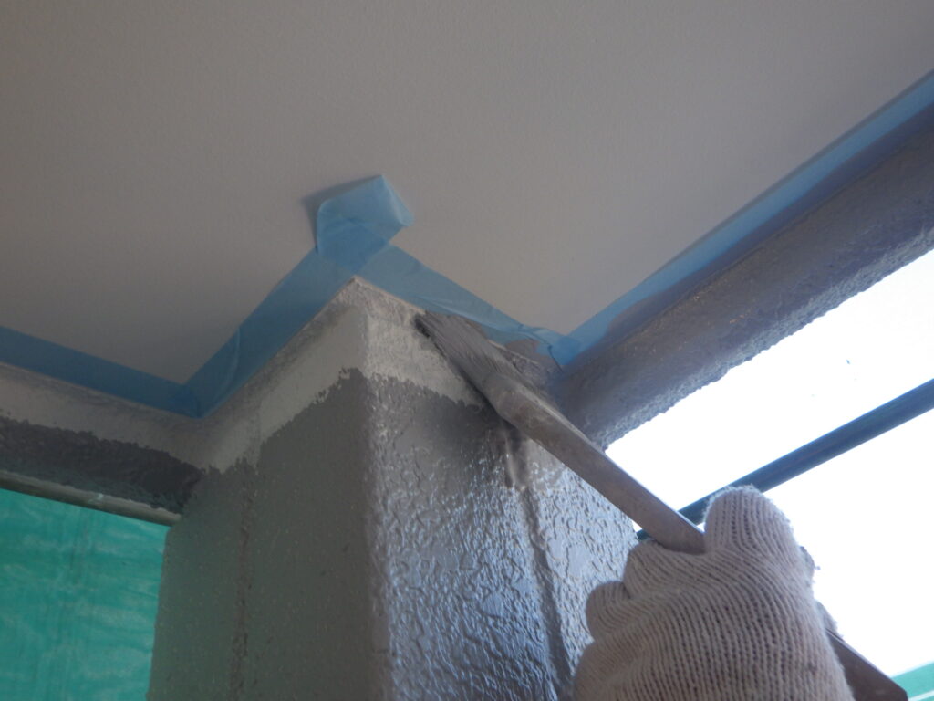 軒天が仕上がっており、外壁との取り合いを綺麗に仕上げていくために、剥がしやすく粘着力の弱いマスキングテープで真っすぐなラインを出します。