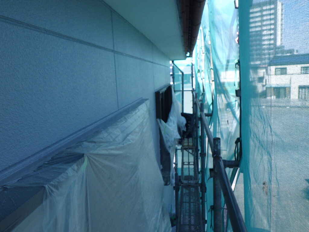 軒天と外壁の塗装が完了したので、塗料が完全に乾いた箇所から順に、サッシ回り等の養生を撤去して行きます。