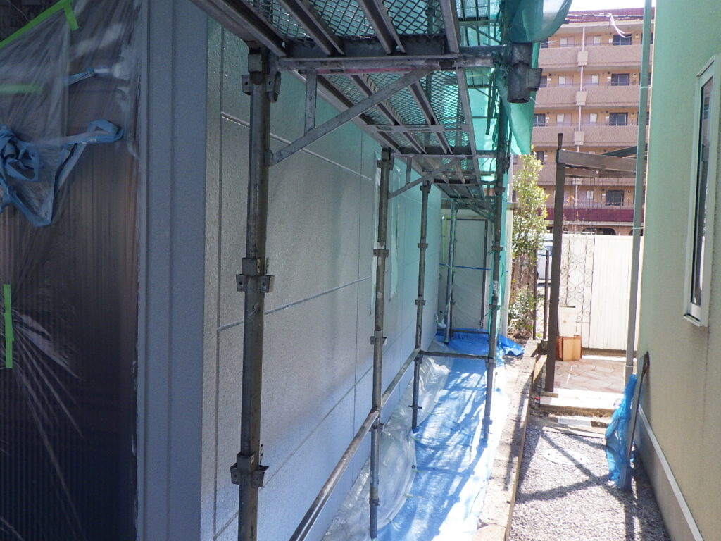 仕上がった外壁に塗料が付かないよう気を付けながらミニローラーを使用して、塗装しました。