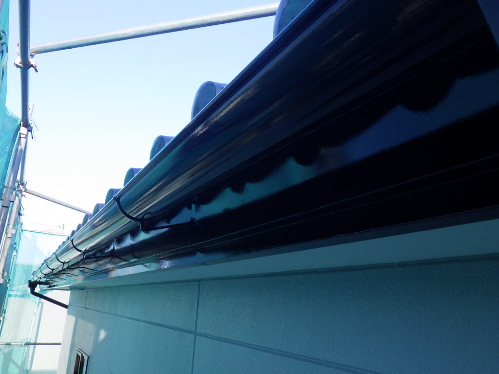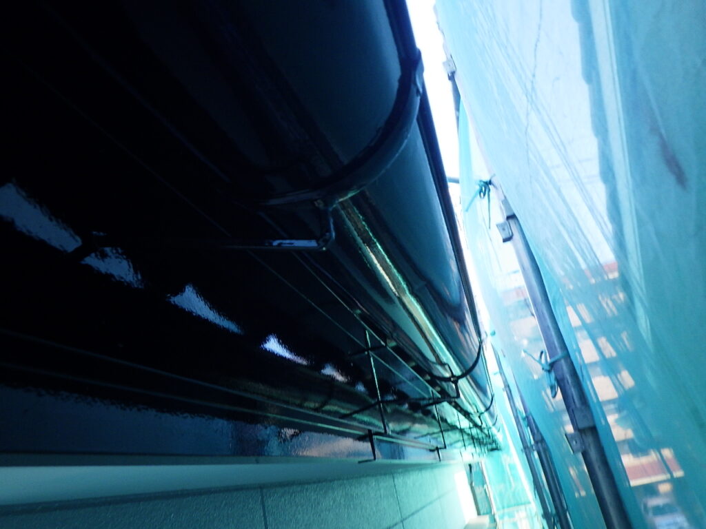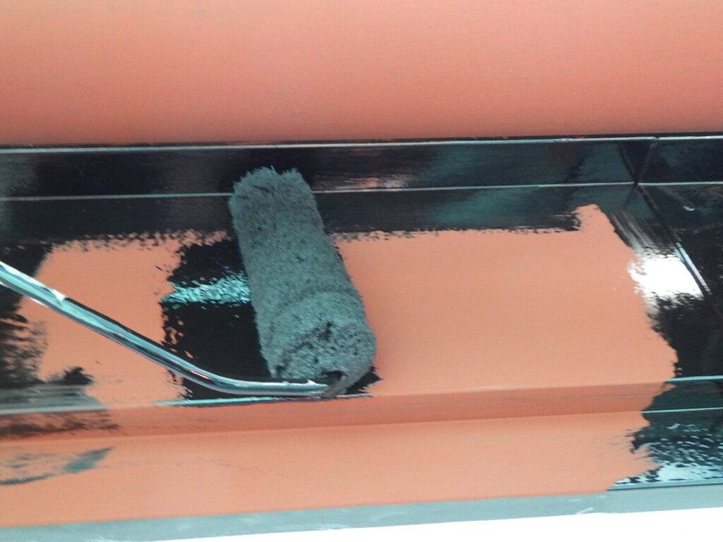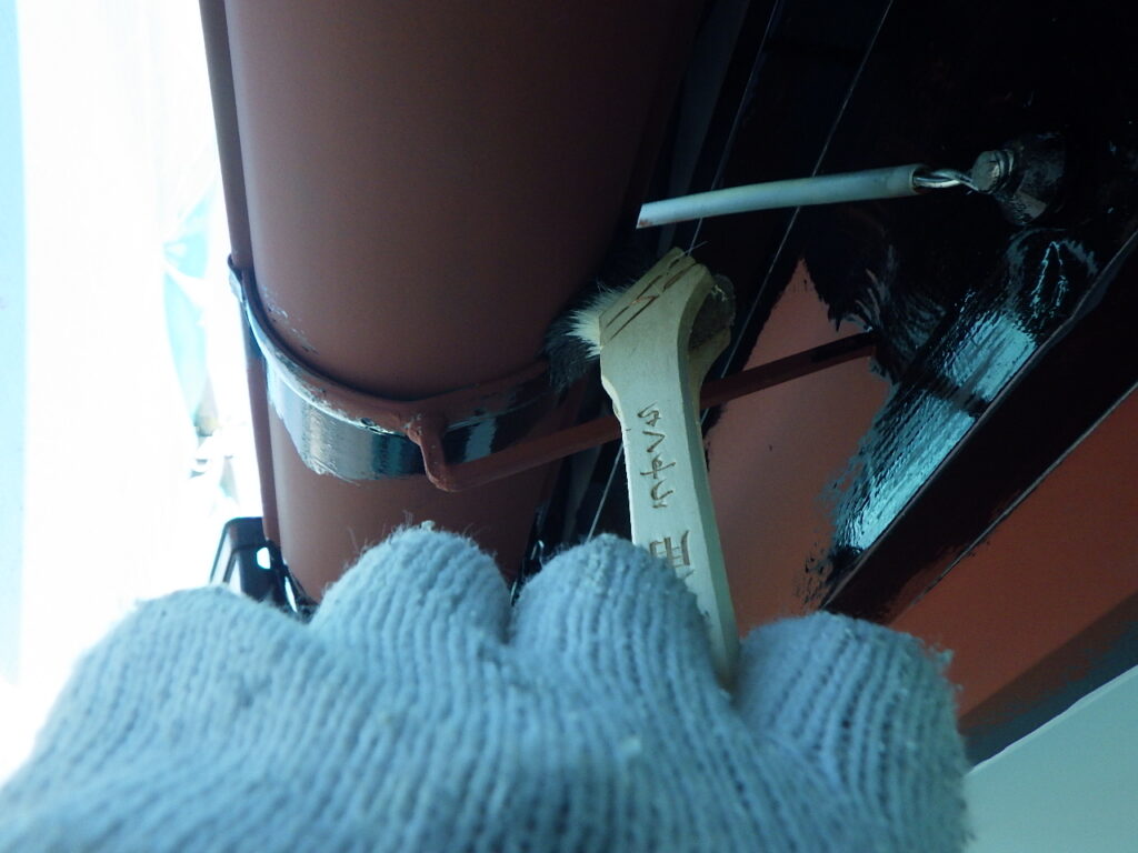 鼻隠し板金と軒樋の中塗り塗装が完了してから、竪樋塗装を上から下に向かって塗装を進めました。