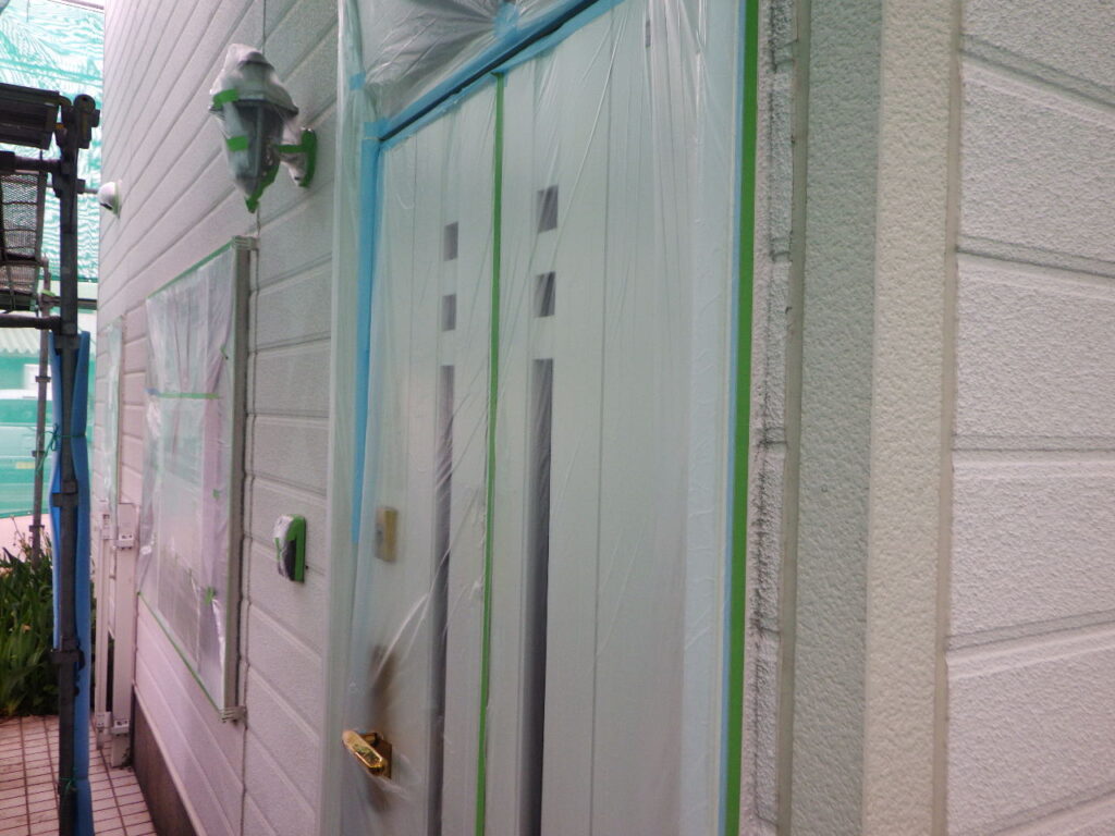 勝手口は工事中の出入りを控えて頂いている為、塗料が完全に付かないように完全に養生で覆います。