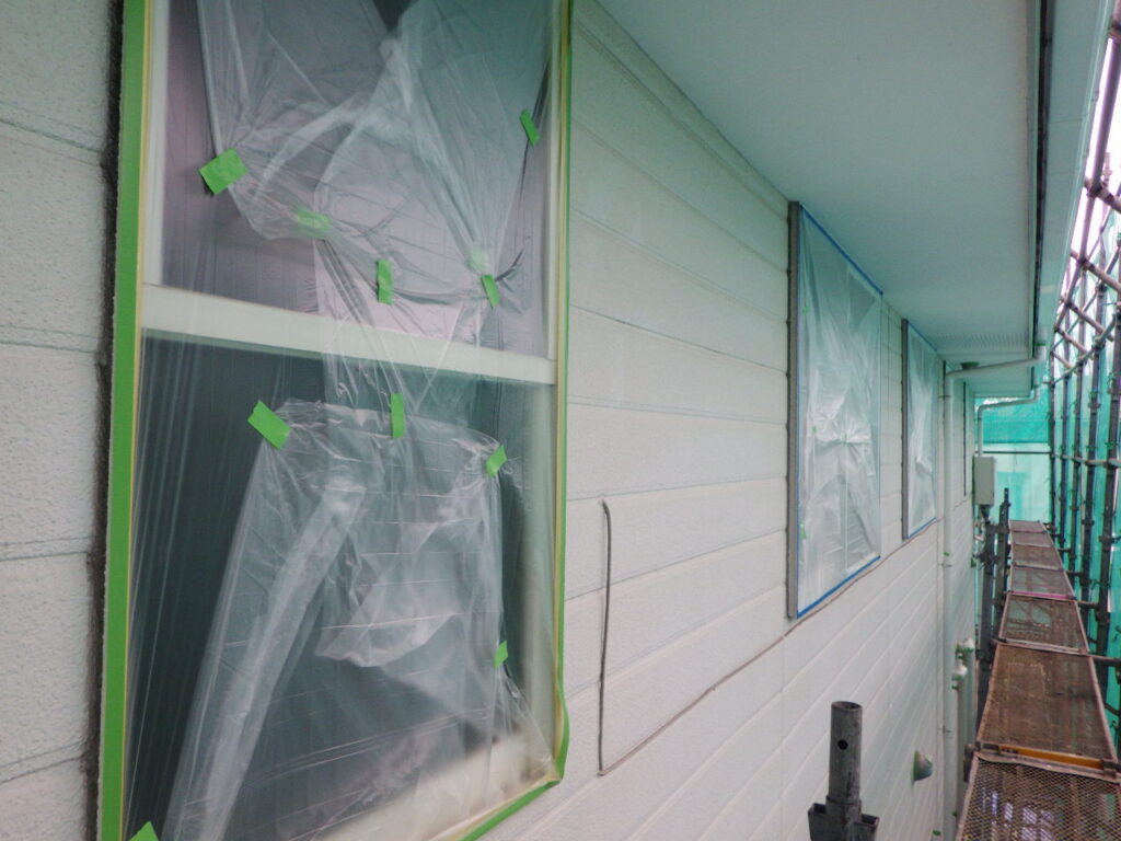 工事期間中は、窓の開閉が出来ないのでご不便おかけしますが、塗料が付いてしまわないよう養生で覆いました。