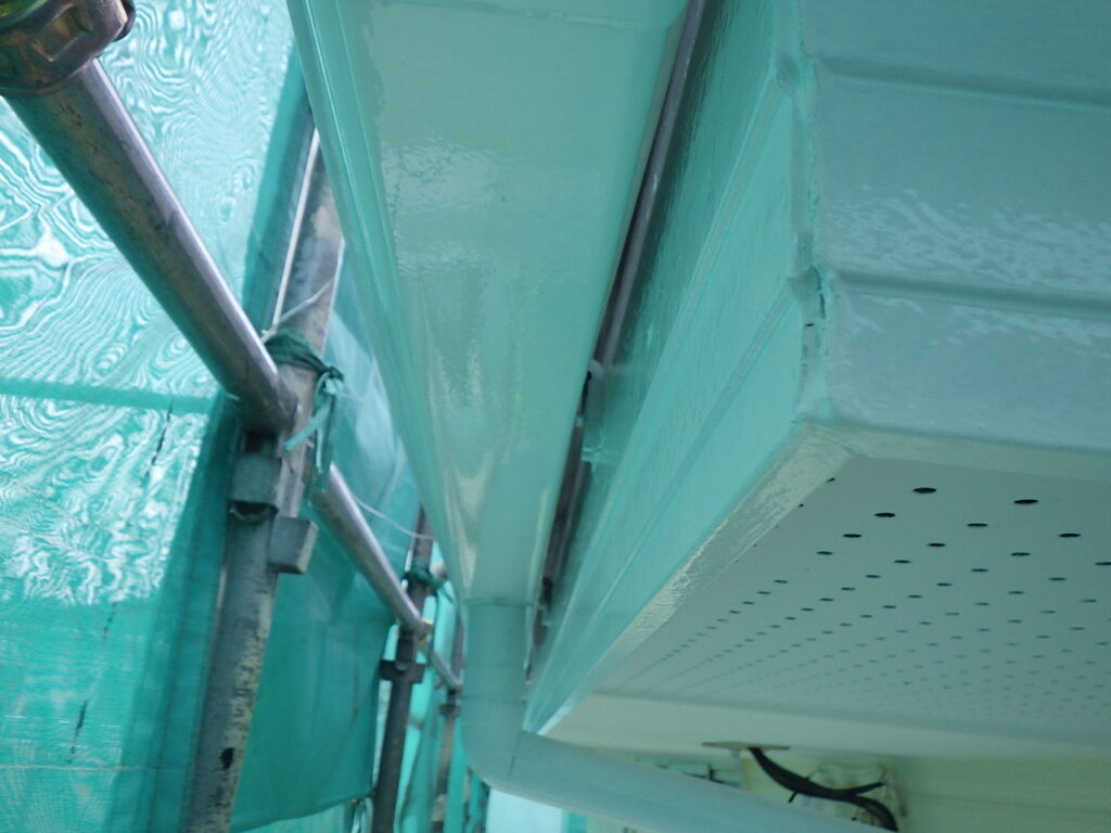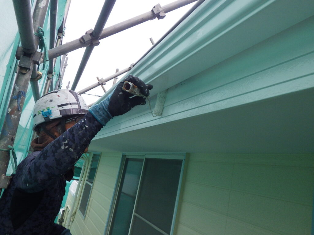 下塗り材が乾いた箇所から、破風板の中塗り塗装と軒樋の一回目塗装を同時に塗り進めていきます。