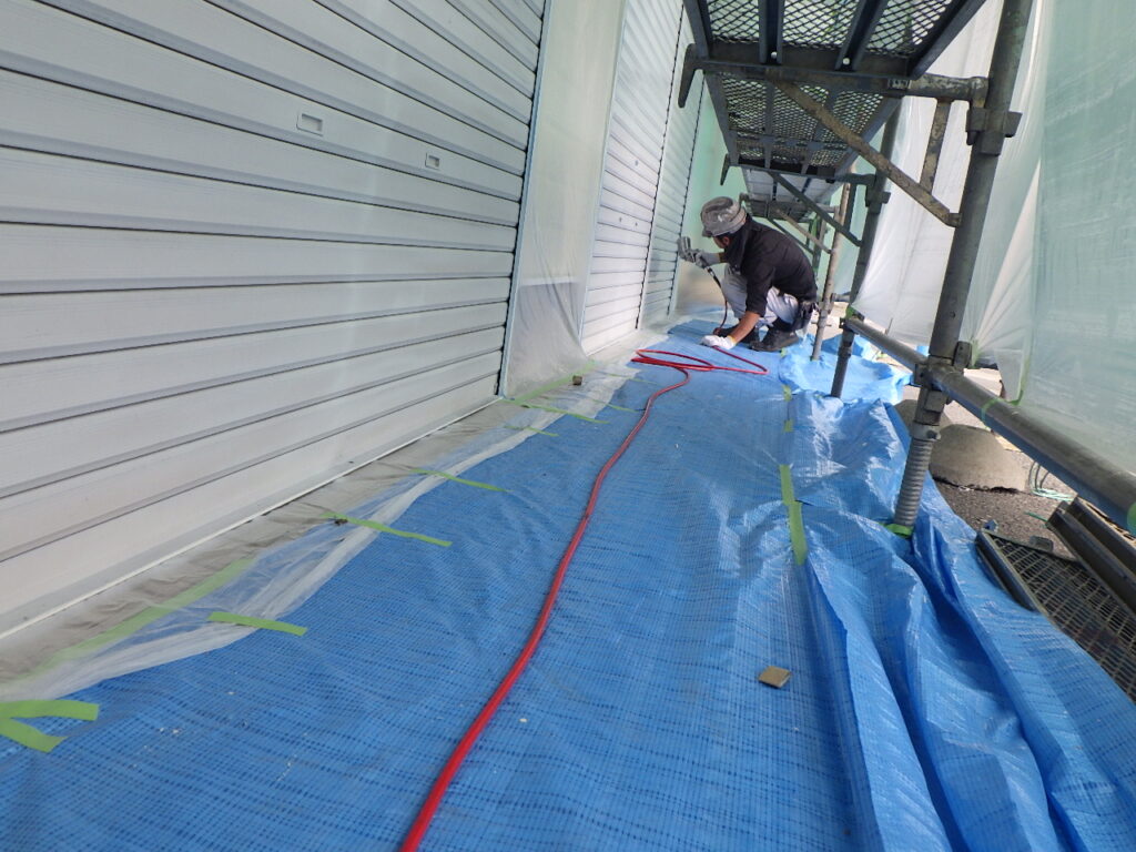 シャッターが幅広く高さもあるので塗装範囲を四分の一に分け、塗料の重なり部分は塗料がダレやすくなるので気を付けながら塗装をしています。