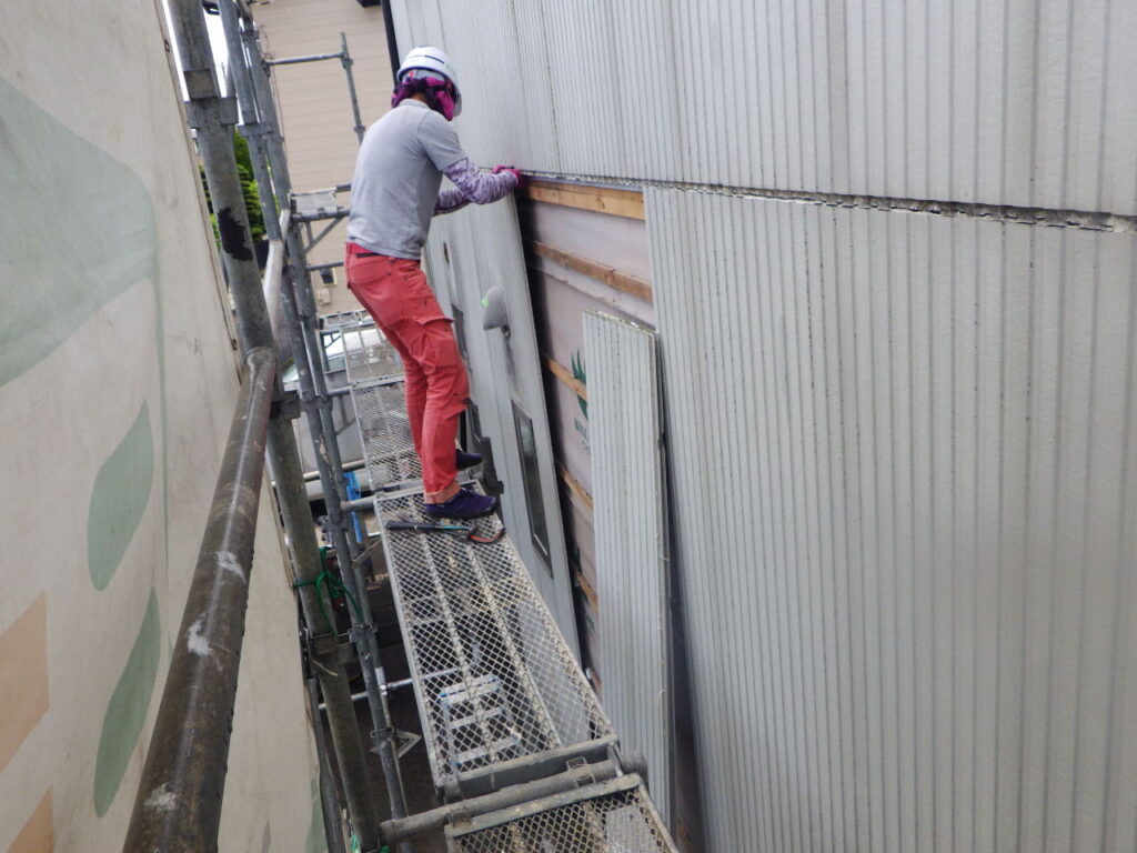 張り替える箇所の外壁材を目地にあるコーキングから剥がしながら、左側から順に外壁材を外していきます。