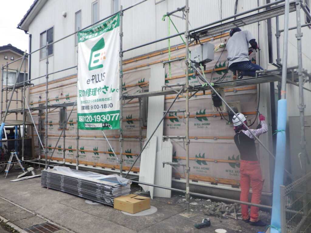 新しく外壁材が取り付けられ次第、元に戻していきます。