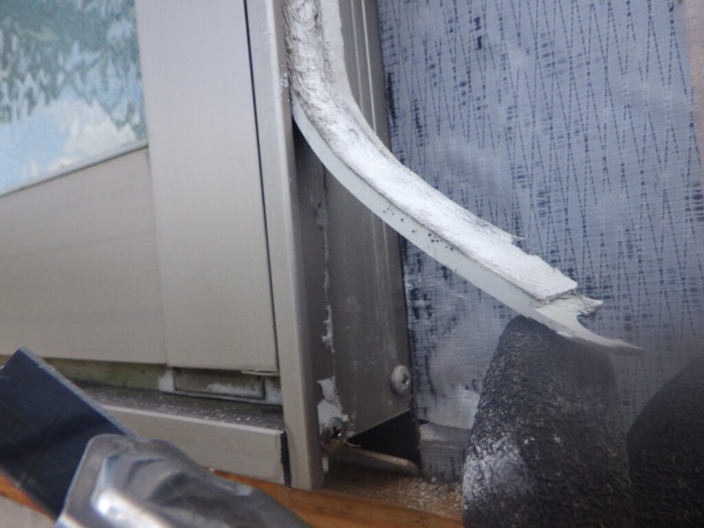 窓サッシ回りや外壁目地に付いているコーキング材は、このまま再利用できないので新しくする為にカッターでサッシ回りを傷つけないよう綺麗に取り除いていきます。