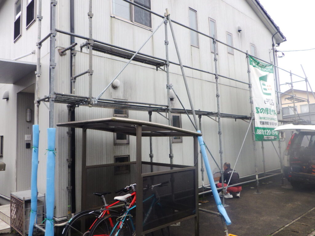 最後の一枚と縦目地があるので外壁材に1~2ミリ被るようにマスキングテープを真っすぐに養生をしました。