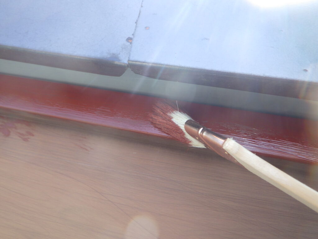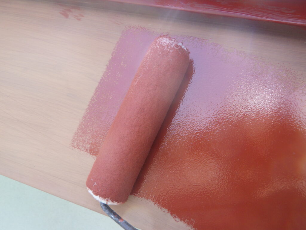 関西ペイントザウルスEXⅡを使用しているので、板金部の下塗り材として適した塗料です。これからの錆の発生を抑え、傷んだ板金表面を強固させることで上塗り塗料との密着性が向上され、仕上がりが抜群に良くなります。ローラーでは塗装がしにくい見切り部分や入り隅等は刷毛でしっかりと塗り込み、平面はローラーを使用し刷毛で塗装をした箇所も一緒になじませることで塗料だまりがなくなり綺麗に仕上がります。